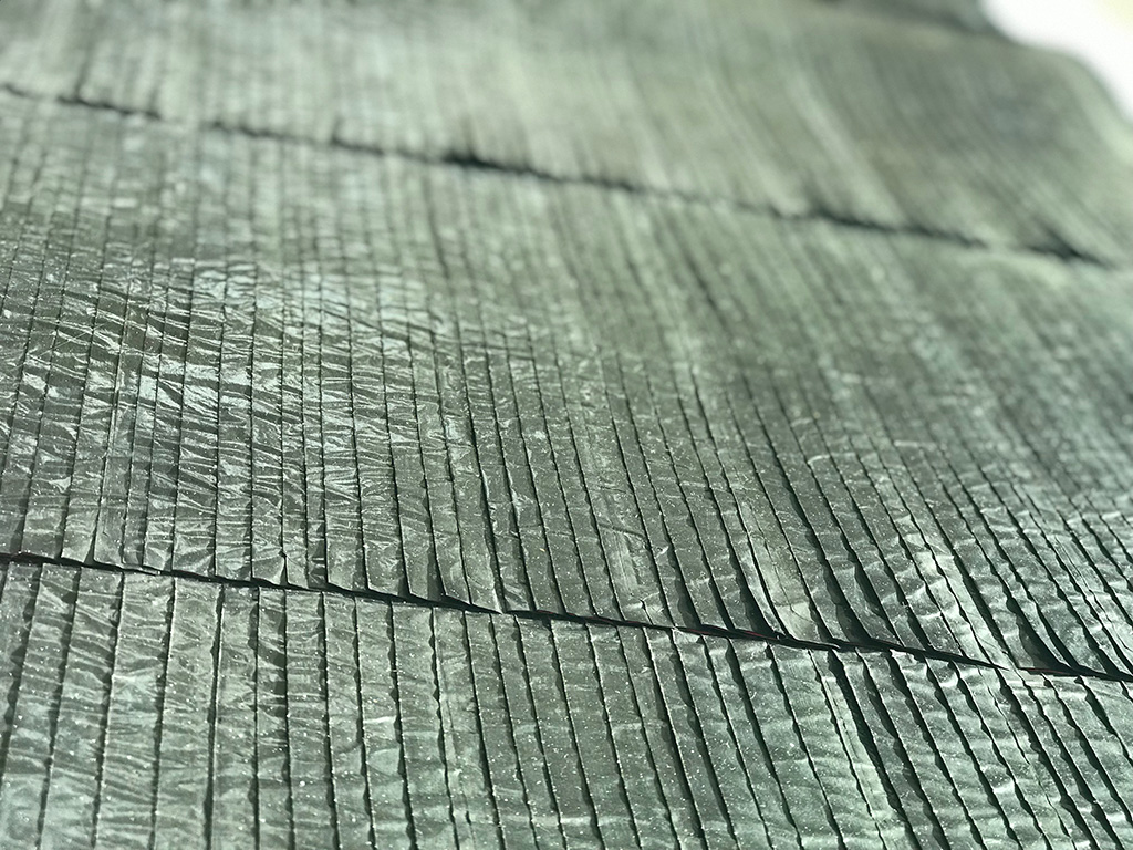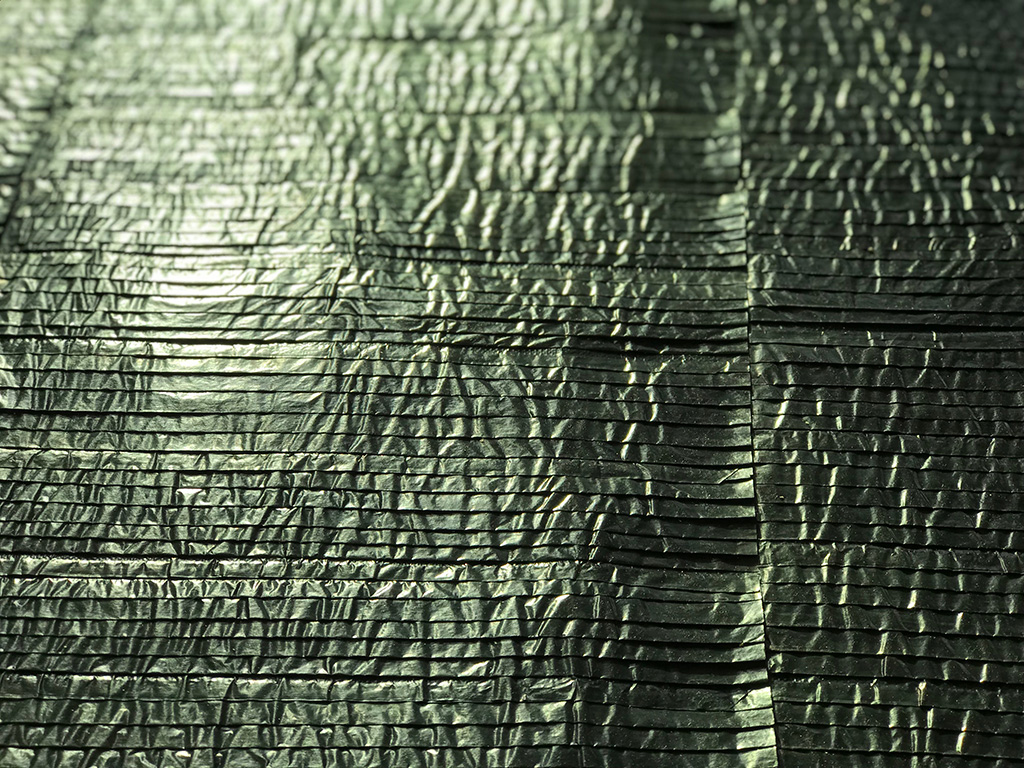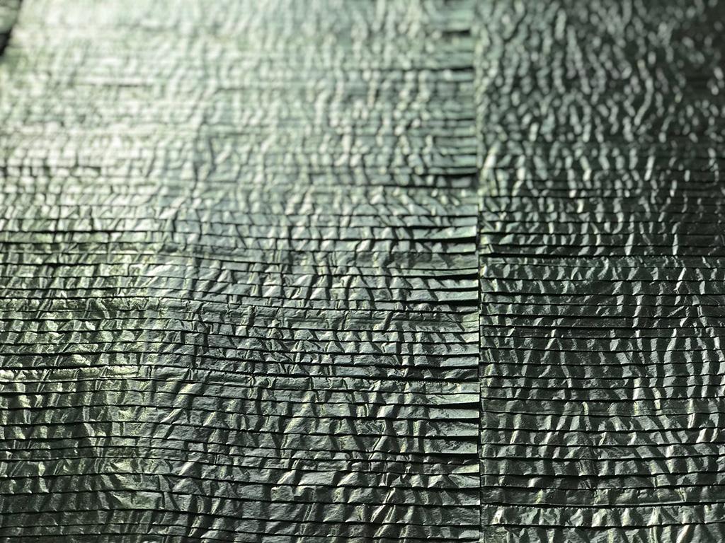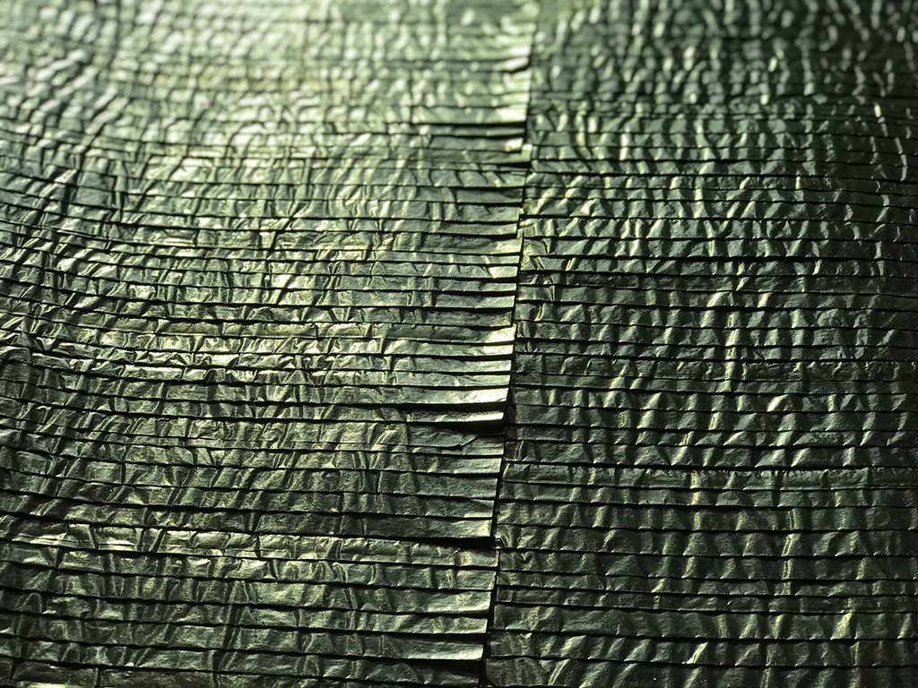 Dans ses œuvres plissées et composées à l'infini de lignes aux plans joints par une arête commune, l'artiste se plie à la succession des enveloppements, rejoignant par une gestuelle en tout point maîtrisée, les philosophes qui ont pensé le pli comme constitutif du dedans de la pensée."