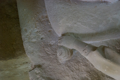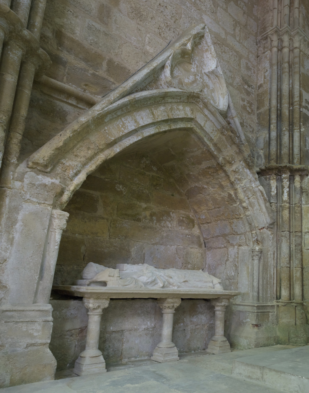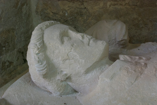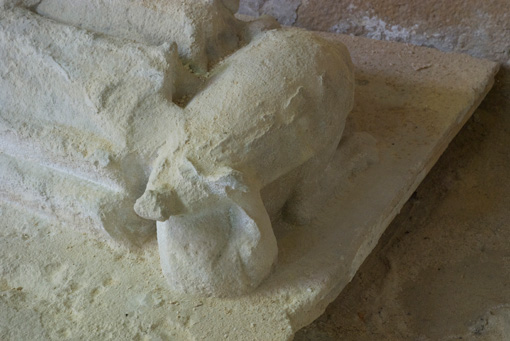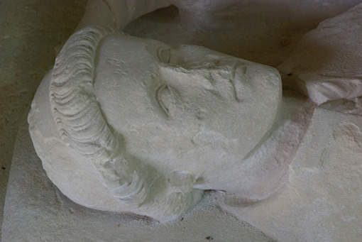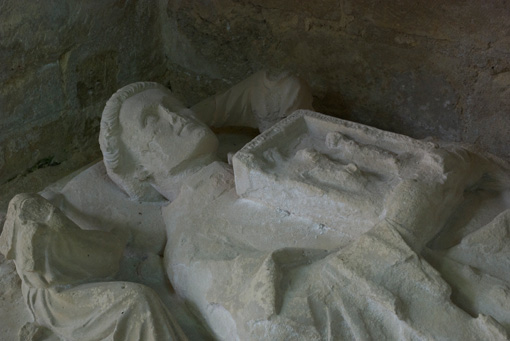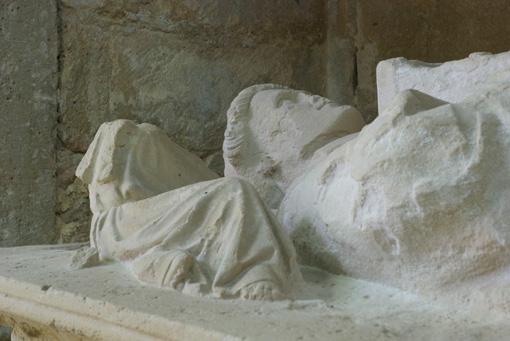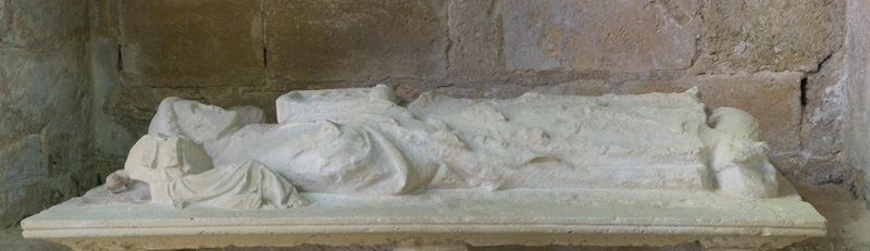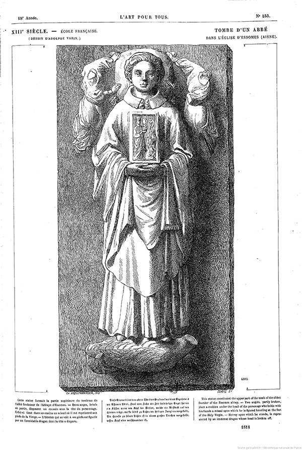 Cette statue formait la partie supérieure du tombeau de l'abbé fondateur de l'abbaye d'Essômes. Deux anges, brisés en partie, disposent un coussin sous la tête du personnage. Celui-ci tient dans ses mains un missel où il est représenté aux pieds de la Vierge. L'Hérésie qui se voit à ses pieds est figurée par un formidable dragon dont la tête a disparu.